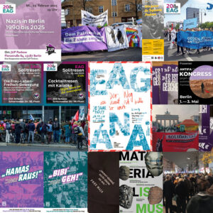 Im Juni ließ die „Jungle World“ in einem ganzseitigen Artikel 20 Jahre EAG und somit 20 Jahre feministische, antisemitismuskritische Antifa-Politik im Berliner Nordosten Revue passieren. Kurze Zeit später war unser Gruppenname in kritischer Absicht neben anderen antisemitismuskritischen Gruppen des öfteren in der „Disko“-Reihe derselben Zeitung zu lesen, als es darum ging, inwiefern das Vorgehen der israelischen Regierung im Gaza-Krieg zu kritisieren ist, was wir über unsere Plakatkampagne für oppositionelle gesellschaftliche Kräfte in Israel und Gaza taten, deren Positionen wir in der hiesigen (Polit-Szene) Debatte stärker sichtbar machen wollten. Für uns ein Hinweis darauf, dass wir neben anderen Gruppen etwas Schwung in den manchmal eingefahrenen Diskurs bringen konnten.