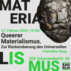 Inwiefern der Gegensatz zwischen Identitätspolitik/Queer/Intersektionalität vs. Universalismus/Feminismus/Materialismus zumindest theoretisch oftmals ein falscher ist, versucht der Vortrag zu zeigen. Stattdessen wir ein queerer Materialismus vorgeschlagen, der dort vermittelt, wo es möglich ist, dabei aber die Widersprüche beider Seiten nicht zudeckt.