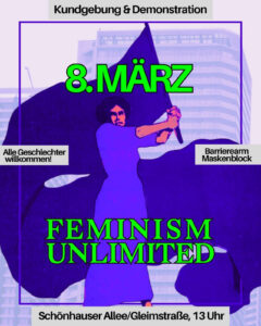 Wir richten uns damit gegen selektiven Feminismus, ob aus biologistischen, queerfeindlichen, antisemitischen oder rassistischen Argumentationen und stehen gemeinsam gegen jede patriarchale Unterdrückung. Für einen linksradikalen und antikapitalistischen Feminismus!